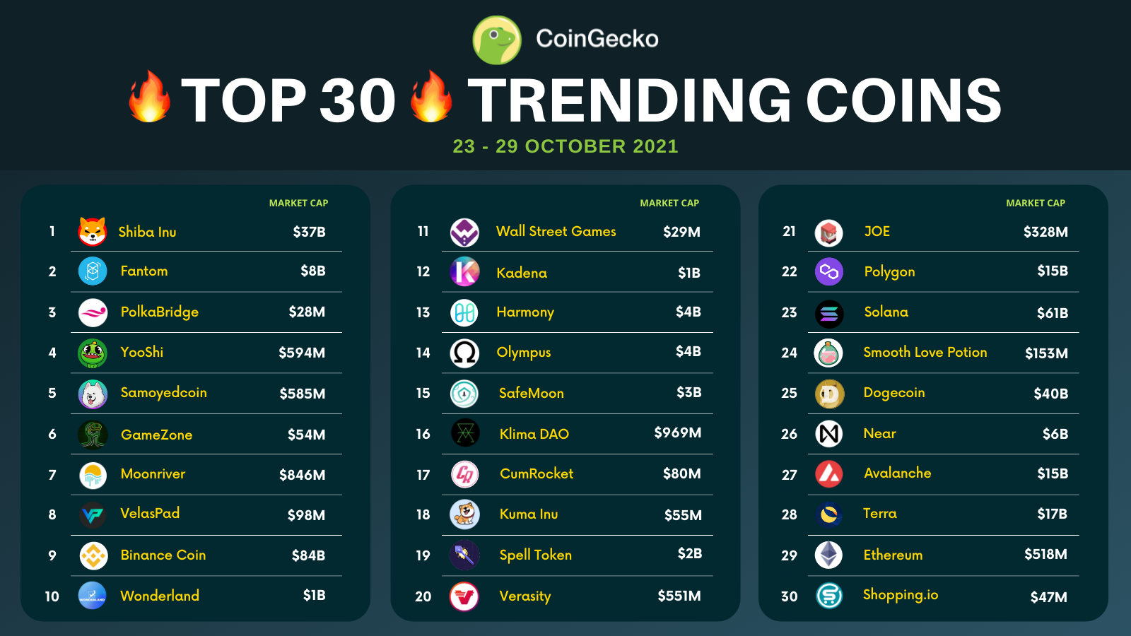 | | CFDs are complex instruments and come with a high risk of losing money rapidly due to leverage. 68% of retail investor accounts lose money when trading CFDs with this provider. You should consider whether you understand how CFDs work and whether you can afford to take the high risk of losing your money. Cryptoassets are unregulated in some EU countries and in the UK. No consumer protection. Your capital is at risk. | | | ASIC Resistant Typically used within the crypto world to describe the proof-of-work protocols that aim to prevent the use of ASICs for mining. Typically, this is achieved by making certain adjustments such that a ASIC will not have any competitive advantage over consumer hardware, or through inclusion of many various algorithm that makes it difficult for ASICs to have an edge against regular hardware. The aim of ASIC resistant algorithms are usually to avoid the centralization of mining in that typically happens as ASIC machines. Learn about other Crypto terms here | | | | Here are the top trending coins for this week! | | | | | "WOODLAND CAMO"Artist: Quiccs Gallery: MakersPlace The Woodland Camo is representative of the Military Camo Pattern which is popular within the Hip Hop fashion scene. Quiccs' version of this pop culture staple features a pattern made of the Crossbones Bulletpunk logo. Check out other NFTs on CoinGecko ___________________________________________________________________